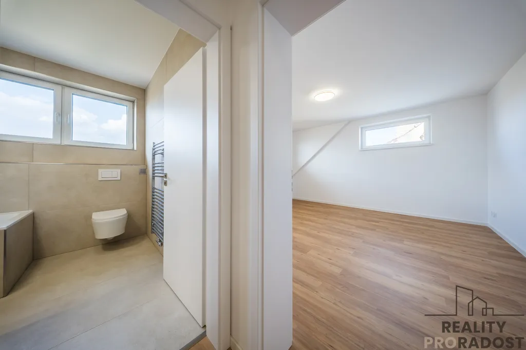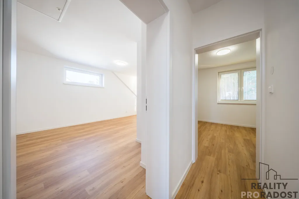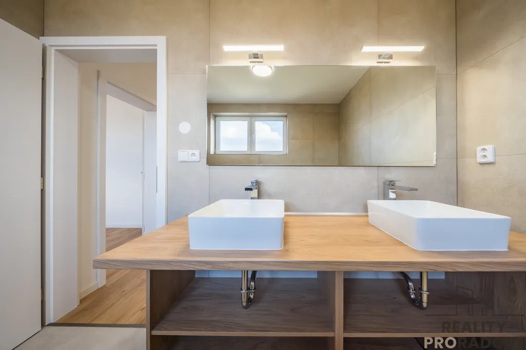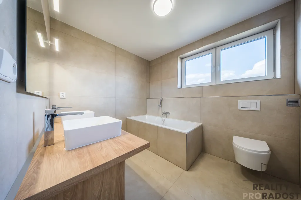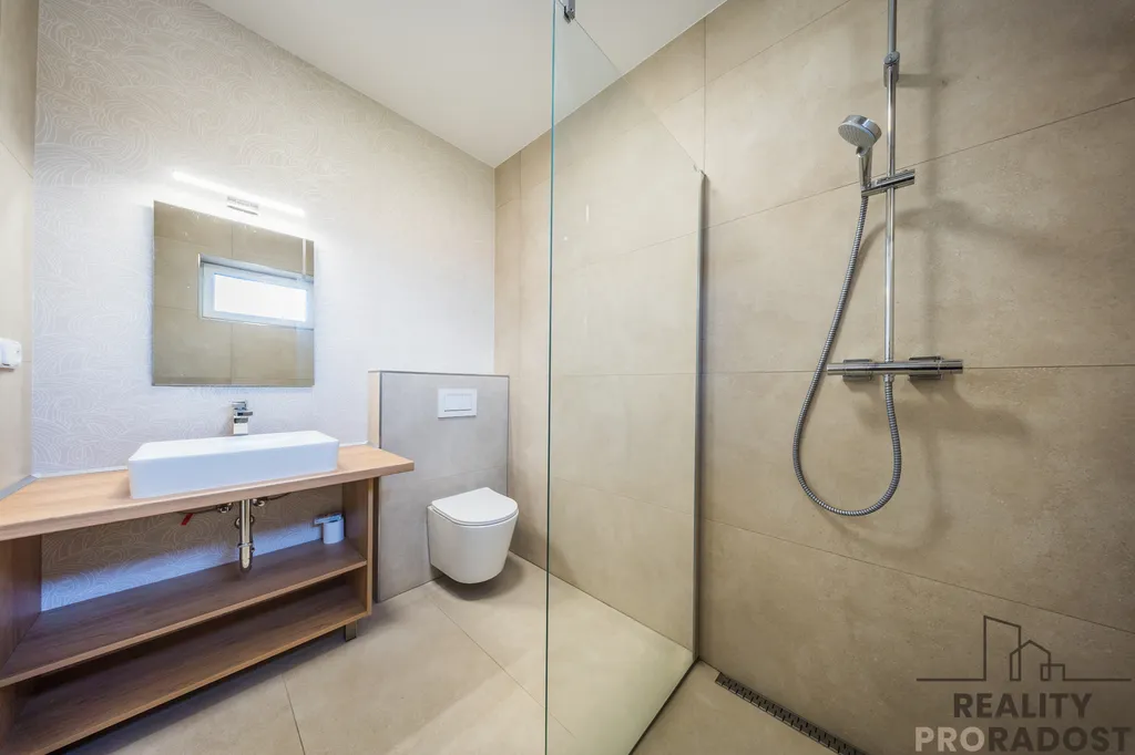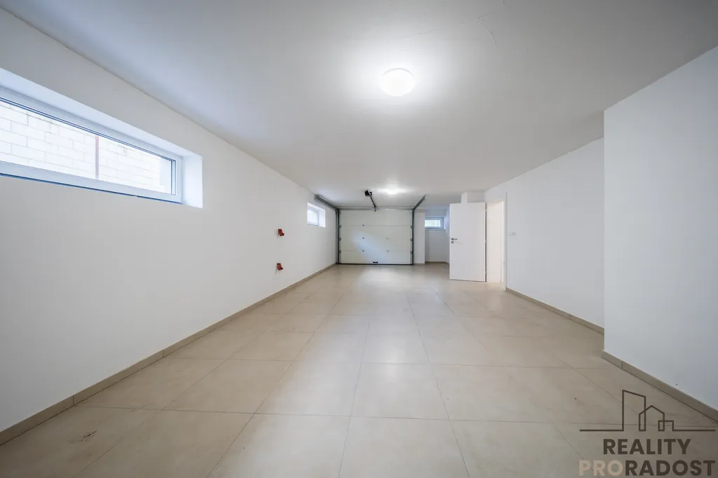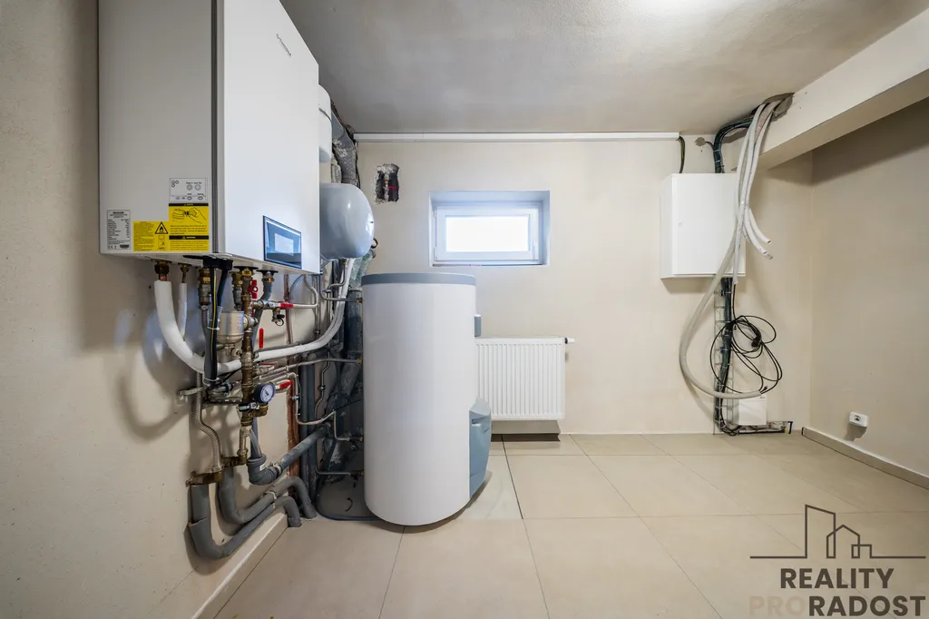 Dům je podsklepený a disponuje garáží pro dvě auta s elektrickými sekčními vraty, technickými a skladovacími prostory, včetně kotelny. Vytápění je řešeno nízkonákladovým tepelným čerpadlem, a to jak pro podlahové vytápění, tak pro přípravu teplé vody, podlaha je keramická dlažba a vinyl, v celém domě jsou kvalitní plastová trojskla a příprava pro instalaci venkovních, elektrických žaluzií.