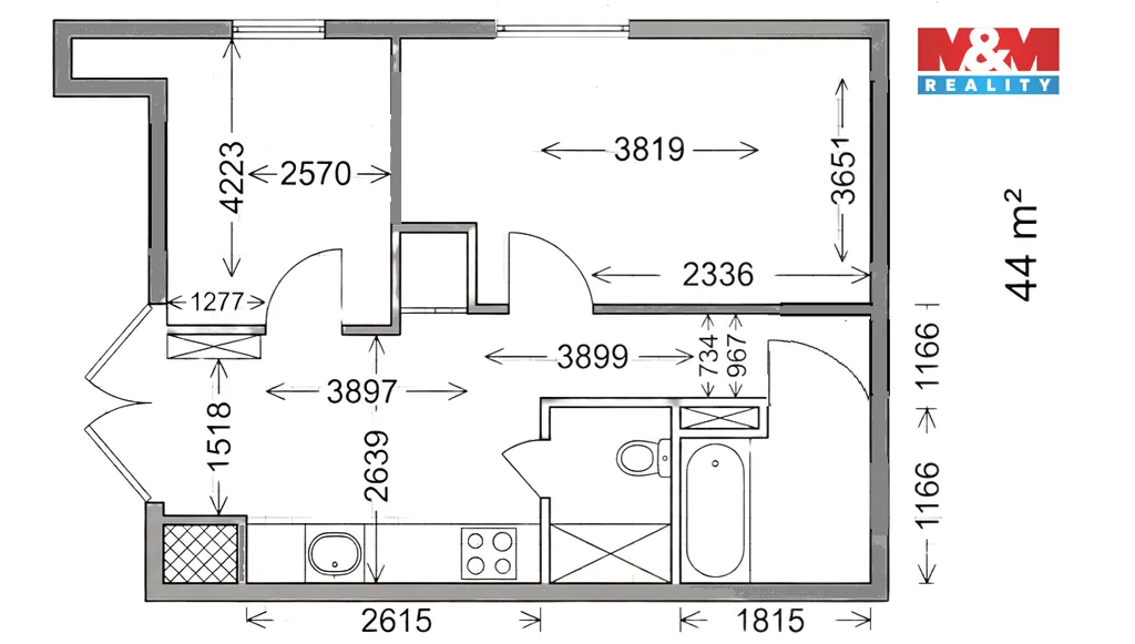 Byt je dispozičně řešen prakticky. Kuchyňský kout je umístěn v předsíni, díky čemuž vznikla další samostatná obytná místnost. Z předsíně je vstup do dvou samostatných místností – větší pokoj je ideální jako obývací prostor, menší místnost lze využít jako ložnici.