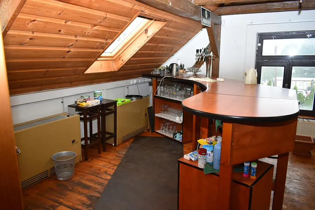 V patře se nachází stylová místnost s barem a kuchynkou. Zde se dají točit různé nápoje a připravovat různé dobroty. Je zde i místnost pro různé hry a WC dámské a pánské. Součástí je i galerie s pěkným výhledem na oslavence.
