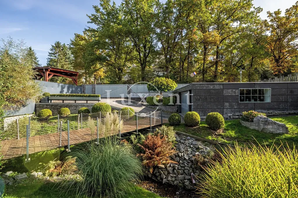 V zadní části domu je druhá terasa se stíněním, vhodná například ke grilování a na ní navazuje volný prostor zahrady. Svah u zahrady je využitý jako bezúdržbová část zeleně a schodiště nás dovede do horní části, kde se nachází ohniště s překrásným výhledem do okolí.