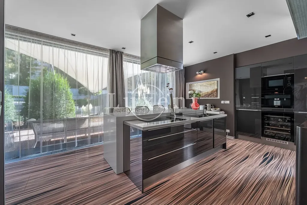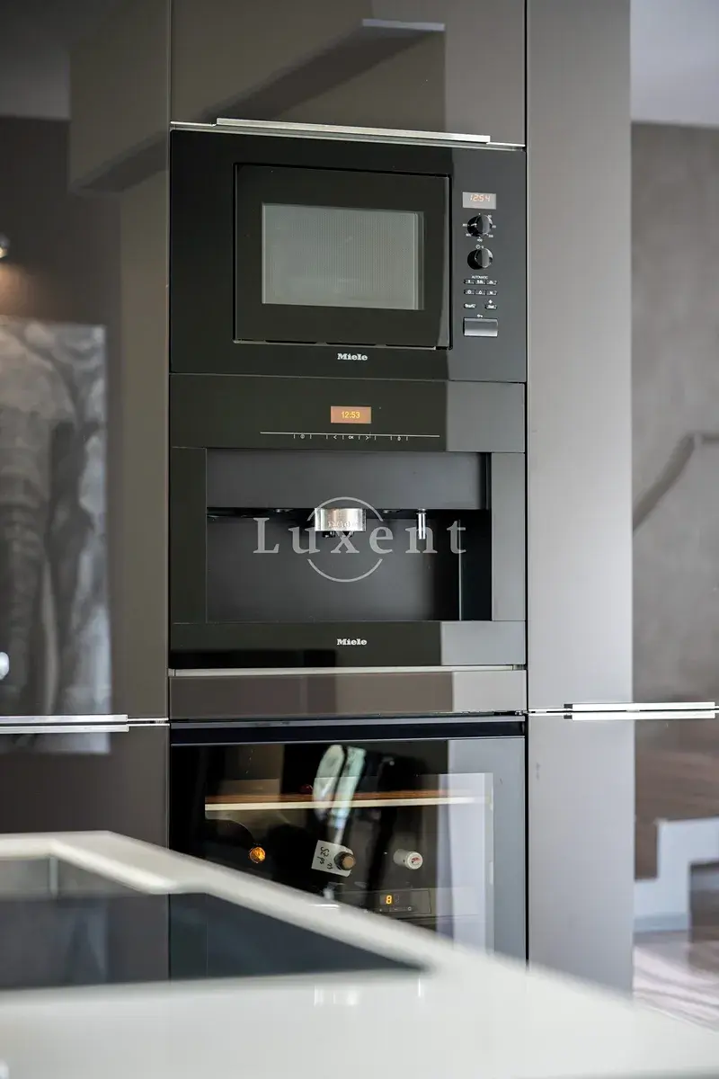 Kuchyně je vybavena špičkovými spotřebiči Miele: parní a horkovzdušnou troubou, indukční varnou deskou, mikrovlnou troubou, vestavěnou lednicí, kávovarem, vinotékou, ale také velmi praktickou ohřívací zásuvkou na jídelní servis.