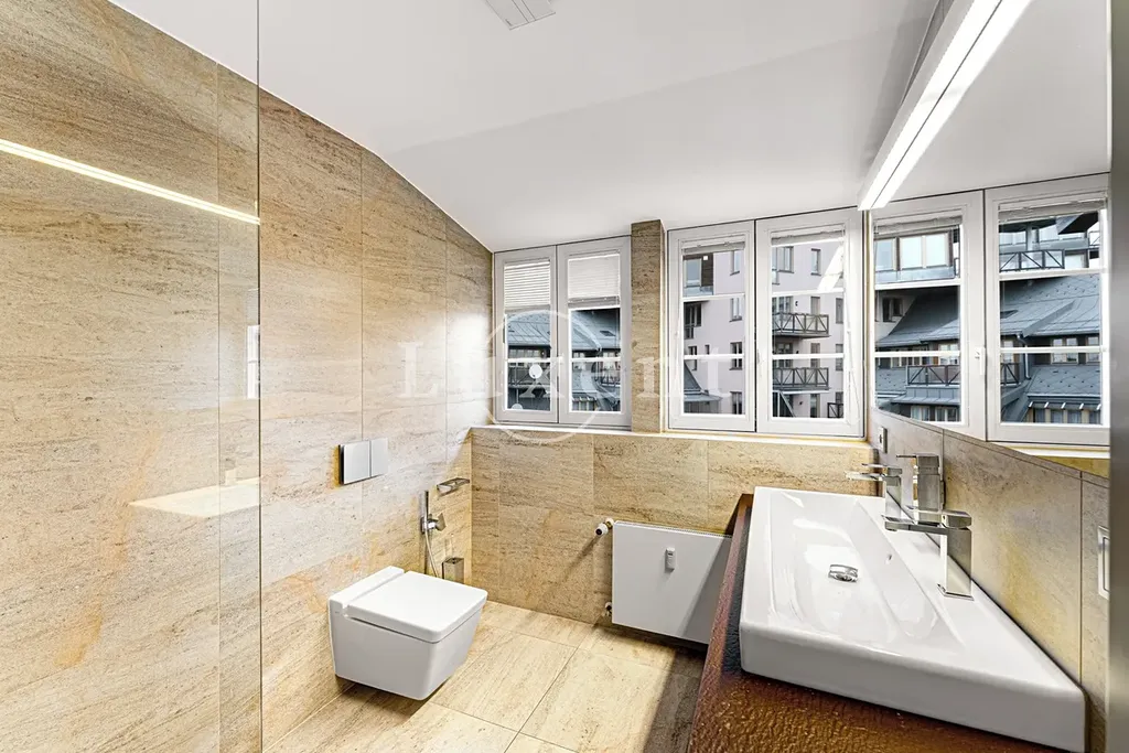 V horním patře bytu se rozkládá prostorný obývací pokoj s příjemnou terasou a otevřenými výhledy. Součástí horního patra bytu je dále plně vybavená kuchyně, jídelní část a odpočinková zóna s koženou sedací soupravou, krbem a kvalitním audio systémem a televizí. V jídelně je vinotéka a jídelní stůl se šesti židlemi. V této části bytu se rovněž nachází koupelna s oknem, walk-in sprchovým koutem a toaletou a dále samostatná komora s úložnými regály, pračkou a sušičkou.
