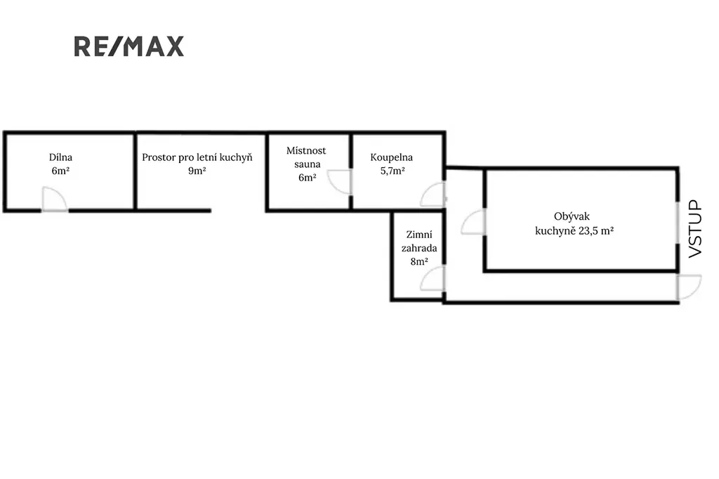 Přízemí: obývací pokoj s kuchyní (23,5 m²), koupelna (5,7m²), místnost s infra saunou (6m²), zimní zahrada(8m²) se vstupem na zahradu (Na zahradě je dílna, a místo pro zbudování letní kuchyně)