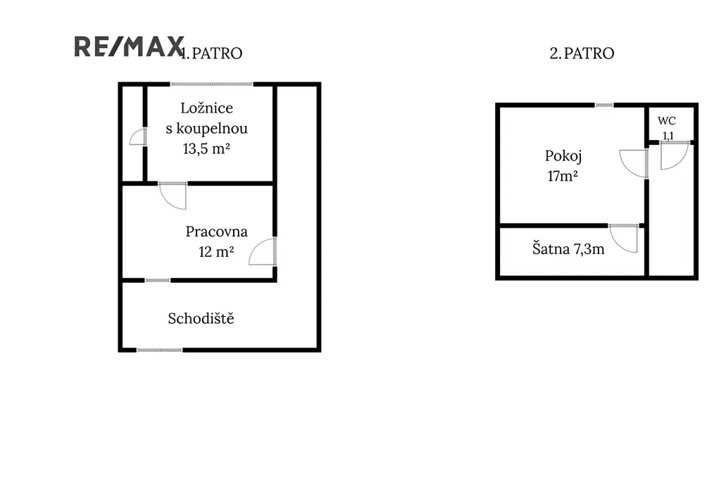 2. patro: dětský pokoj (17m²), šatna (7,3m²), samostatné WC (1,1m²) na chodbě