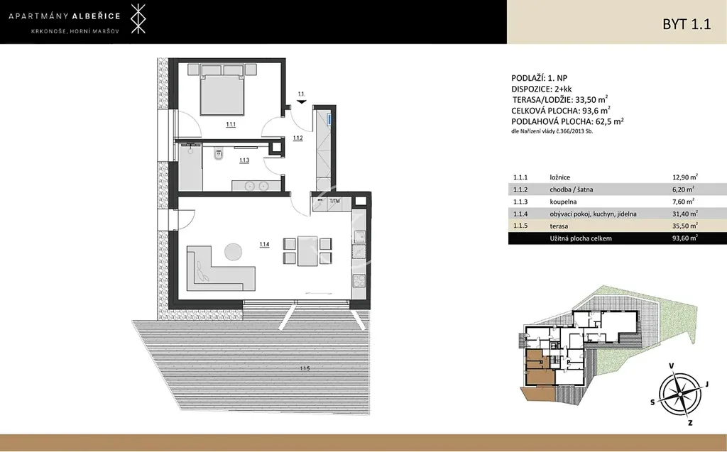 V nově vznikajícím projektu Apartmány Albeřice nabízíme k prodeji apartmán o dispozici 2+kk a ploše 58,1 m2 s terasou 35,5 m2 – celkem 93,6 m2. Apartmán se nachází v 1. NP projektu a je orientován na SZ. Vybaven je ve vysokém standardu, který je možné rozšířit do nadstandardního provedení, zejména co do rozsahu obložení stěn a stropů jednotlivých pokojů rustikálním stařeným dřevem. V případě zájmu můžeme zprostředkovat vybavení bytů kuchyní a nábytkem u renomovaného designového studia v různých cenových hladinách. K apartmánu patří úložné prostory v zabezpečeném samostatném skladu. K bytu náleží kryté parkovací stání v ceně 450.000 Kč - není zahrnuto v ceně bytu. K využití bude také venkovní sauna a společná lyžárna v 1. NP s uzamykatelnými boxy.