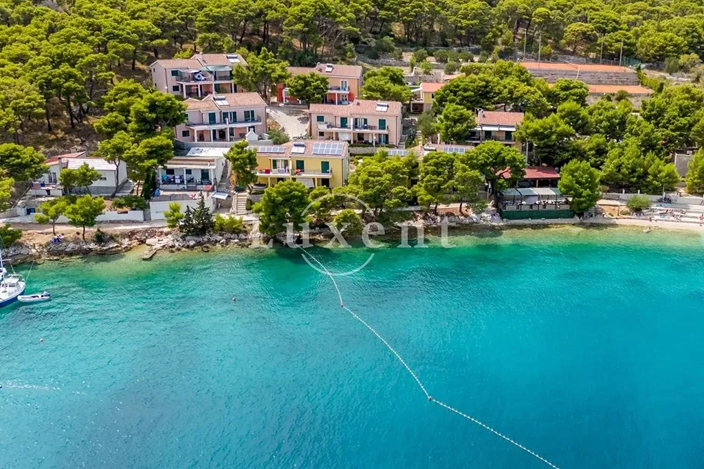 Nabízíme k prodeji apartmánový dům který rozkládá na dvou podlažích, přičemž každé z nich nabízí dva samostatné apartmány. Současná dispozice je ideální pro turistický provoz, ale s minimálními úpravami je možné objekt přetvořit i na komfortní rodinnou vilu – například s denními prostory v přízemí a ložnicemi v patře. Hlavní terasa o rozloze 85 m2 nabízí ničím nerušený výhled na moře a zátoku. Před domem se nachází rozsáhlá zahrada o velikosti 180 m2, která zajišťuje soukromí a navazuje na okolní přírodní prostředí.