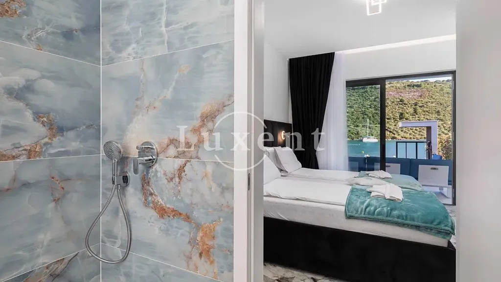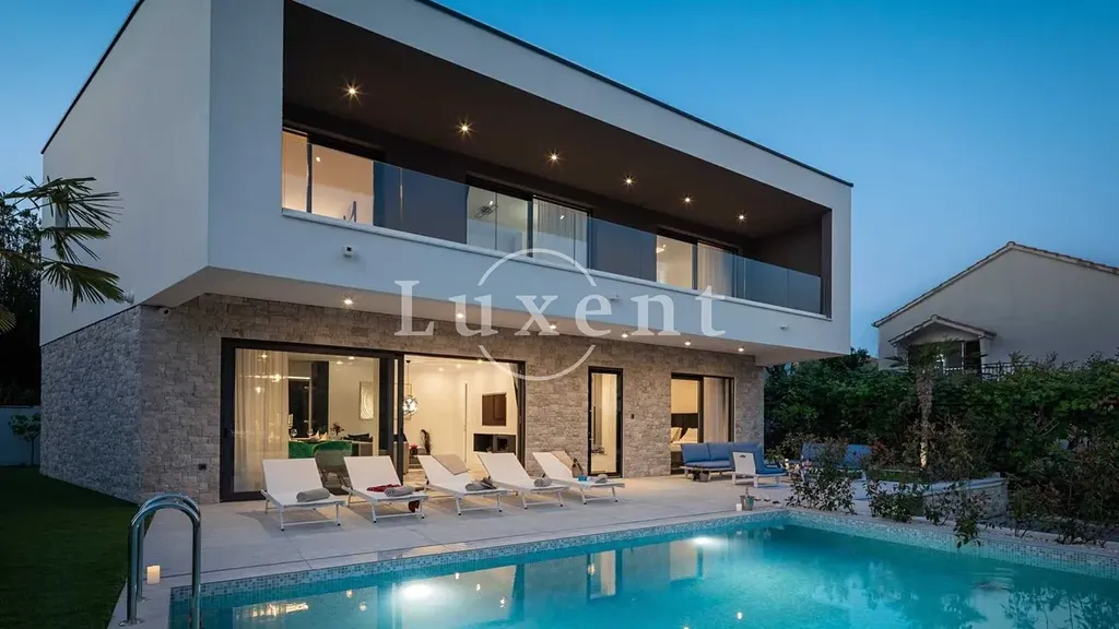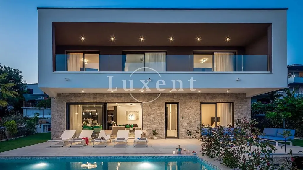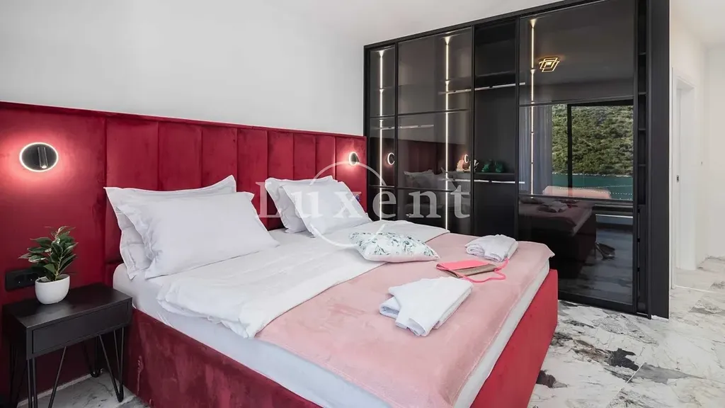 Nabízíme k prodeji elegantní a nově dokončenou vilu s bazénem, situovanou v první linii u moře v klidné zátoce nedaleko oblíbeného letoviska Rogoznica. Tato výjimečná nemovitost, zkolaudovaná v roce 2024, nabízí vysoký standard bydlení i výborný investiční potenciál pro prémiové turistické pronájmy.