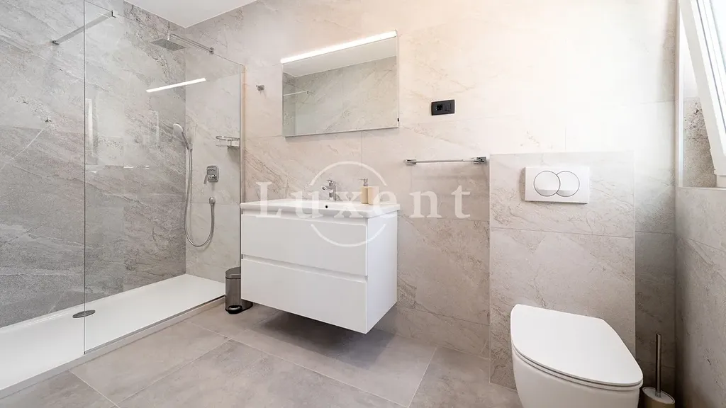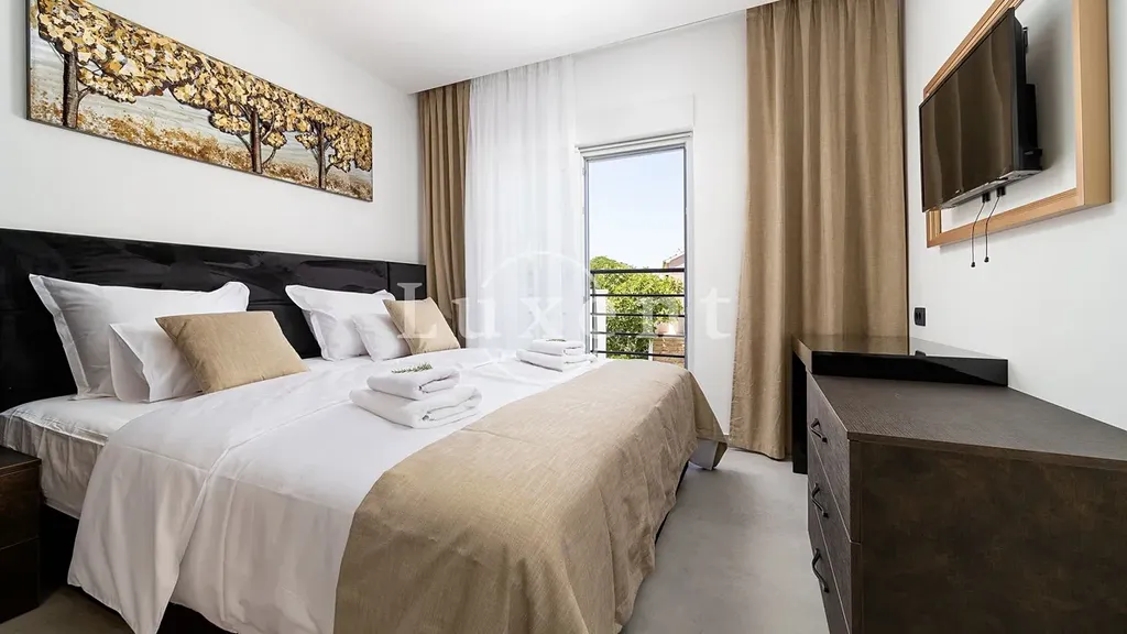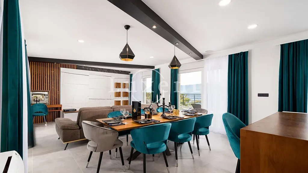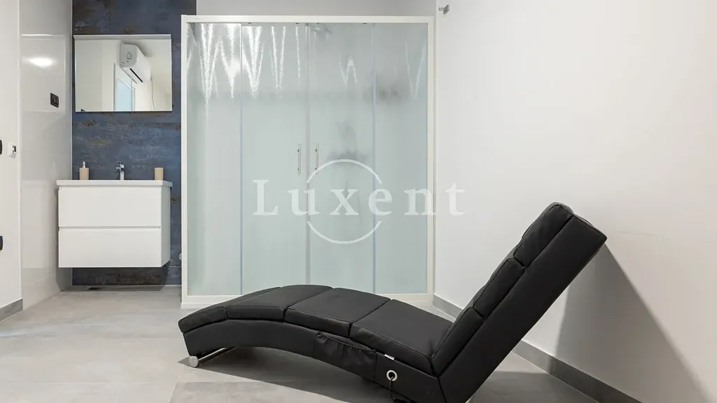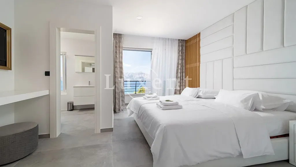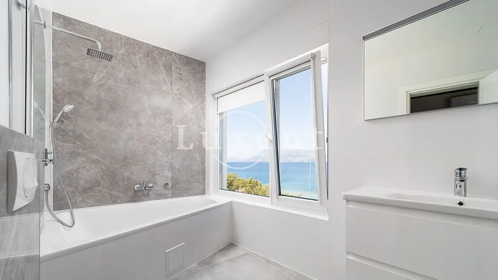 V suterénu se nachází místnost určená pro volnočasové aktivity, prostorná tělocvična a elegantní koupelna. Přízemí domu tvoří světlý, moderně zařízený obývací pokoj propojený s kuchyňským koutem, jedna ložnice, další koupelna a tři terasy – z toho dvě částečně kryté, ideální pro klidné chvíle i letní večery s přáteli. V prvním patře se nachází čtyři ložnice s vlastními koupelnami a dva balkony, které nabízejí panoramatické výhledy na moře a okolní pobřeží.