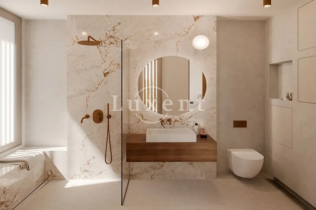 V prvním patře se nacházejí čtyři elegantní ložnice, z nichž každá má vlastní koupelnu a přístup na balkon nebo terasu. Hlavní ložnice orientovaná na jih je navíc vybavena samostatnou šatnou a nabízí nádherný výhled na moře.