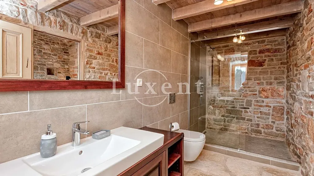 Hlavní dům o zastavěné ploše 120 m2 je rozdělen do tří podlaží. V suterénu se nachází technická místnost a prostor ideální pro vinotéku či tradiční dalmatskou konobu. V přízemí se rozprostírá stylová kuchyně s barem, jídelna, obývací pokoj s krbem, toaleta a dvě ložnice s vlastními koupelnami. V podkroví se pak nachází další dvě ložnice, rovněž s en-suite koupelnami.