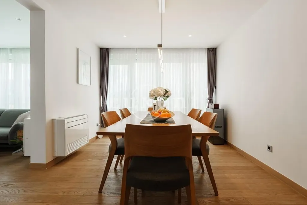 Tento prostorný a kompletně zrekonstruovaný apartmán o velikosti 108 m2 se nachází v sedmém patře moderního bytového domu s výtahem. Je orientován na východ, sever a západ, což zajišťuje dostatek denního světla po celý den. Dispozice zahrnuje vstupní halu, chodbu, hlavní koupelnu, technickou místnost, prádelnu, tři ložnice – přičemž hlavní ložnice má vlastní en-suite koupelnu – dále moderní kuchyni propojenou s jídelnou a obývacím pokojem, odkud je přímý vstup na prostorný balkon s nádherným otevřeným výhledem na moře.