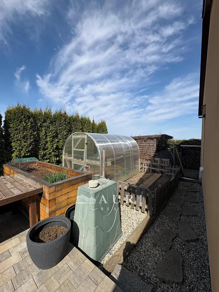 Součástí nemovitosti je také bazén, dva zahradní domky a dřevník. Zahrada je osázena okrasnými stromy a doplněna velmi poutavou skalkou, která celému exteriéru dodává osobitý a harmonický charakter.