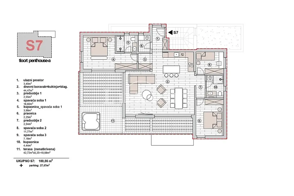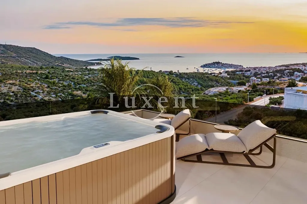 Nabízíme k prodeji luxusní penthouse v moderní rezidenční budově, s orientací na jih, se špičkovou architekturou a nádherným panoramatickým výhledem na moře. Prostorný interiér o velikosti 124 m2 doplňuje velkolepá terasa (43 m2) se soukromou vířivkou, která je ideálním místem pro odpočinek.