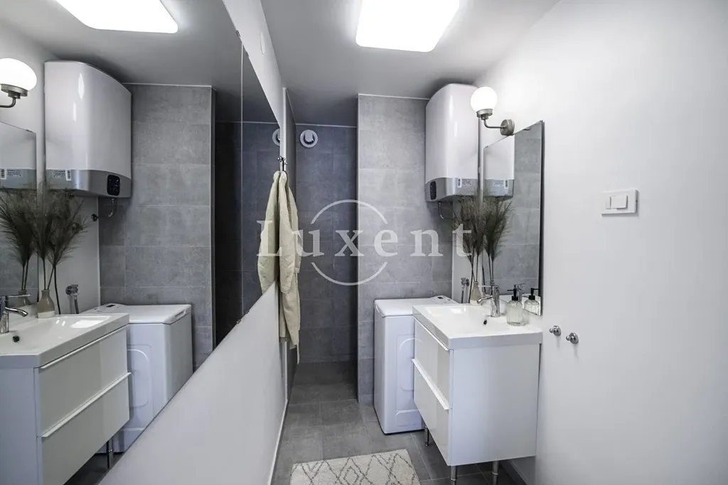 Interiér domu je laděn v moderním stylu s důrazem na čisté linie, funkčnost a pohodlí. Každé podlaží je prosvětlené denním světlem a z vyšších pater se otevírá krásný výhled na moře. Exteriér doplňuje parkovací zázemí s dostatkem prostoru pro několik vozidel. Dům představuje ideální příležitost pro komfortní rodinné bydlení, výnosnou turistickou investici nebo kombinaci soukromého a podnikatelského využití.