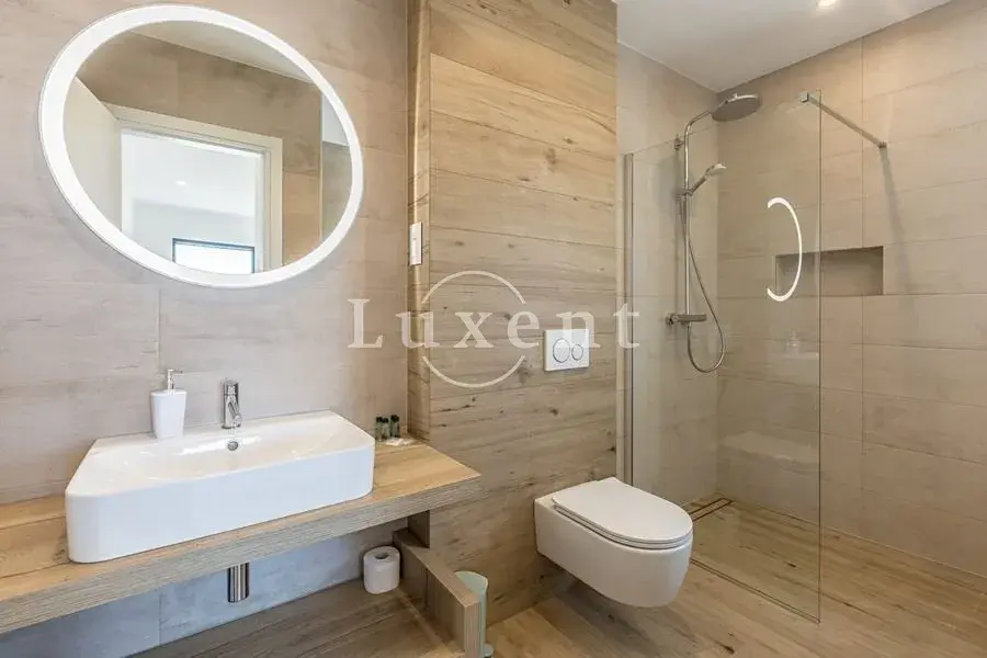 V prvním patře jsou tři ložnice, každá s vlastní koupelnou, které zajišťují soukromí a komfort pro rodinu či hosty. Vila je navržena tak, aby většina místností nabízela nerušený výhled na moře, což umocňuje pocit prostornosti a propojení s okolní krajinou.
