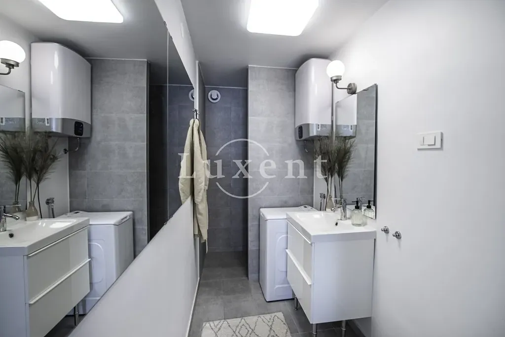 Terasa je částečně zastřešená (12 m²) a částečně otevřená (36 m²), díky čemuž je příjemné posezení venku možné prakticky celý den. Apartmán je prodáván kompletně vybavený včetně veškerého nábytku, spotřebičů a klimatizace – stačí přijet a hned bydlet nebo pronajímat.