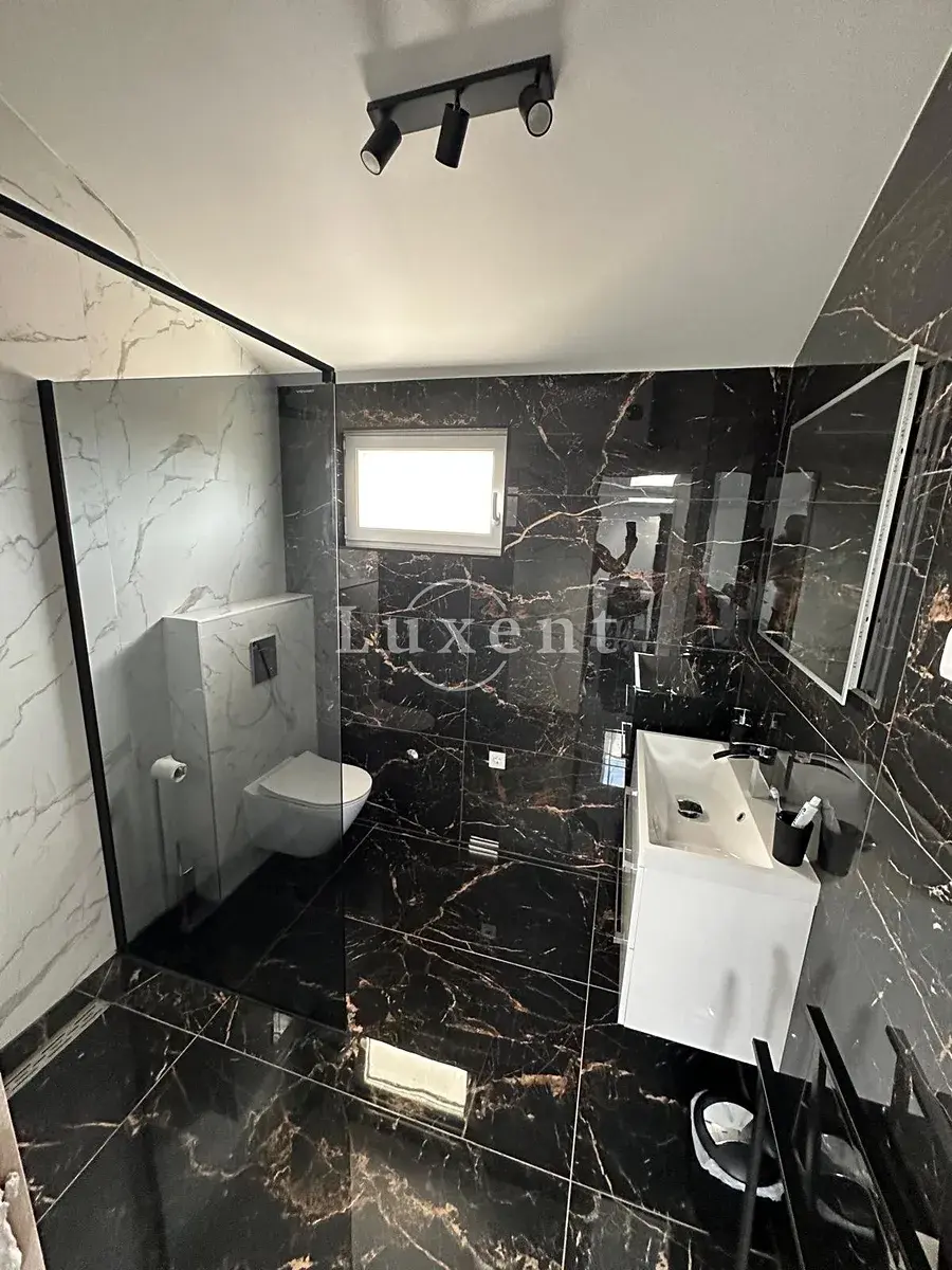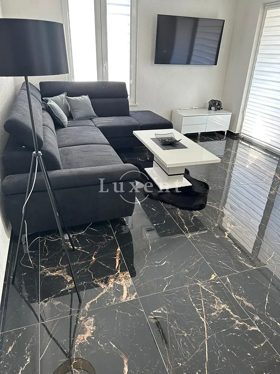 K apartmánu patří sklep 9 m², dvě parkovací místa na dvorku budovy a všechny potřebné povolení (stavební, užívací, výměr, etažování, vlastnický list). Okna jsou plastová (PVC stolarija), topení klimatizací, připojení na městský vodovod, kanalizaci a elektřinu.