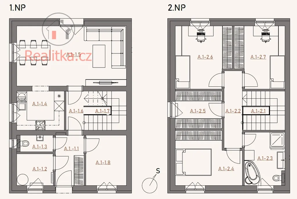 • 1. patro: Nabízí dva samostatné pokoje, praktickou šatnu a koupelnu se sprchovým koutem, dvoj-umyvadlem a tepelným žebříkem.