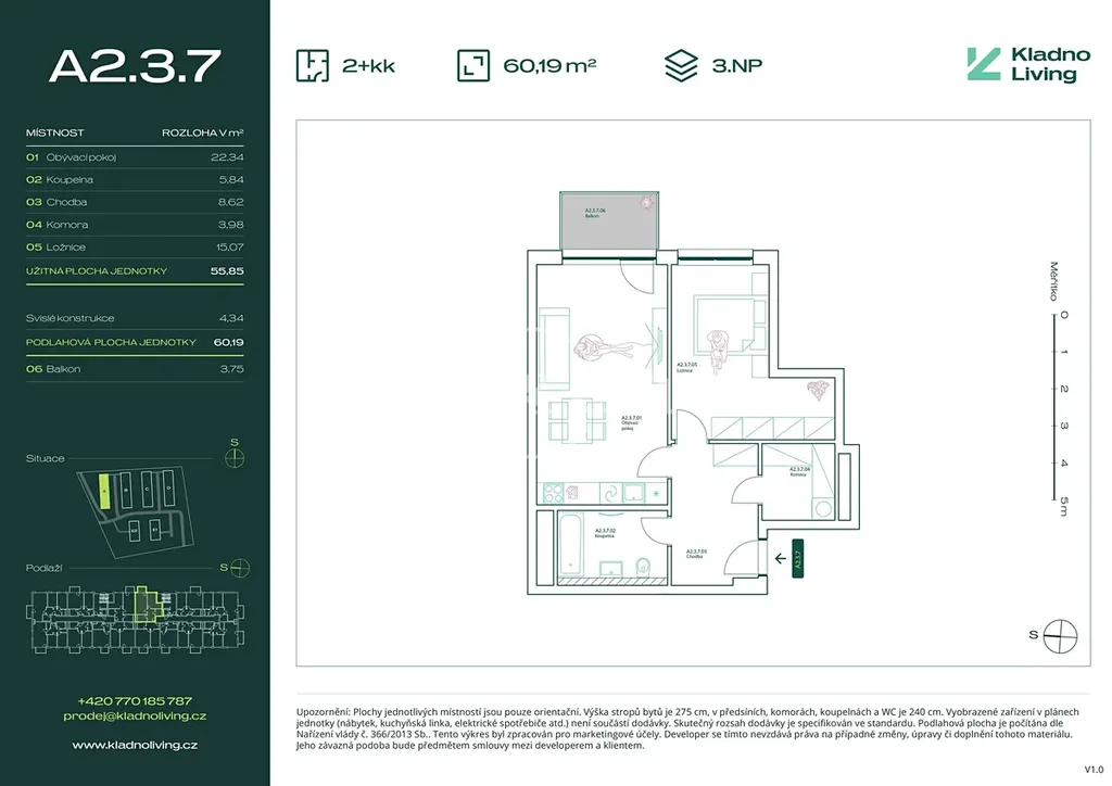 Nabízíme ke koupi moderní byt 2+kk o podlahové ploše 60,2 m² s balkonem 3,8 m² v rezidenčním projektu Kladno Living, který vzniká v jedné z nejatraktivnějších lokalit města Kladno – Kročehlavy. Tento nový developerský projekt představuje jedinečnou příležitost pro ty, kteří hledají nové byty v Kladně nebo investici do nemovitosti s vysokým potenciálem zhodnocení.