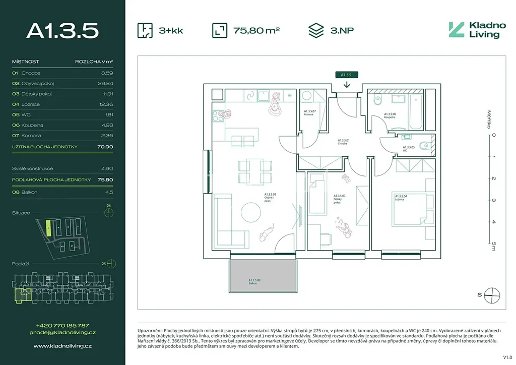 Nabízíme ke koupi moderní byt 3+kk o podlahové ploše 75,8 m² s balkonem 4,5 m² v rezidenčním projektu Kladno Living, který vzniká v jedné z nejatraktivnějších lokalit města Kladno – Kročehlavy. Tento nový developerský projekt představuje jedinečnou příležitost pro ty, kteří hledají nové byty v Kladně nebo investici do nemovitosti s vysokým potenciálem zhodnocení.