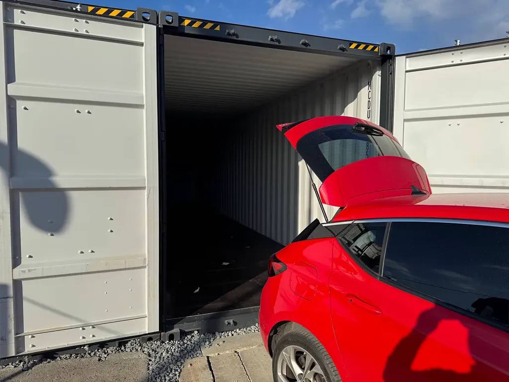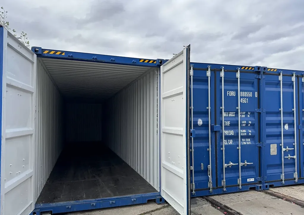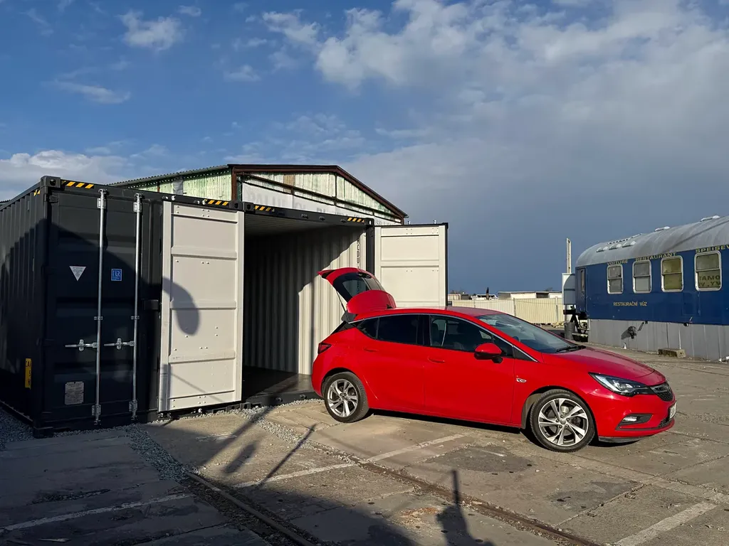 Dvoukřídlá vrata 2,343 m x 2,690 m. Kontejnery jsou přístupné autem až ke dveřím s dostatečným prostorem pro manipulaci. Objem kontejneru 75,7 m3.