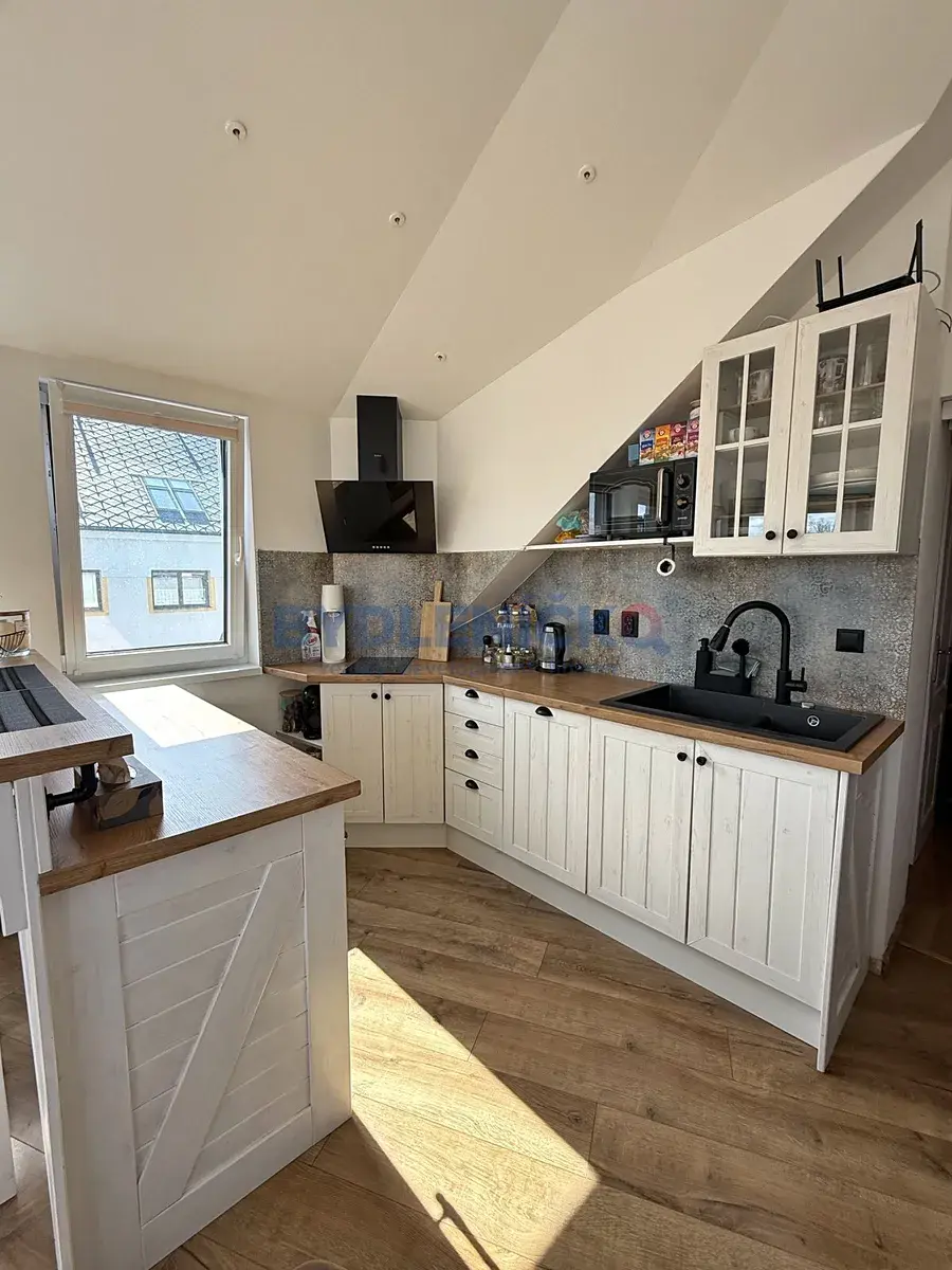 Tento atypický byt je tvořen dvěmi velmi prosvětlenými pokoji: ložnice s orientací na východ a obývací pokoj s elektrickým krbem, kuchyňským koutem a barovým sezením. Dále je zde prostorná předsíň a koupelna s vířivou vanou a toaletou. Byt se pronajímá v kompletně vybaveném stavu tak, jak je patrné z fotografií.