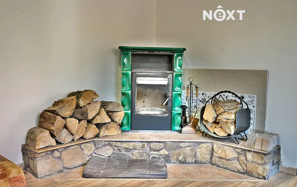 Vytápění: Atmosféru domova dotváří krbová kamna, doplněná o elektrické přímotopy.