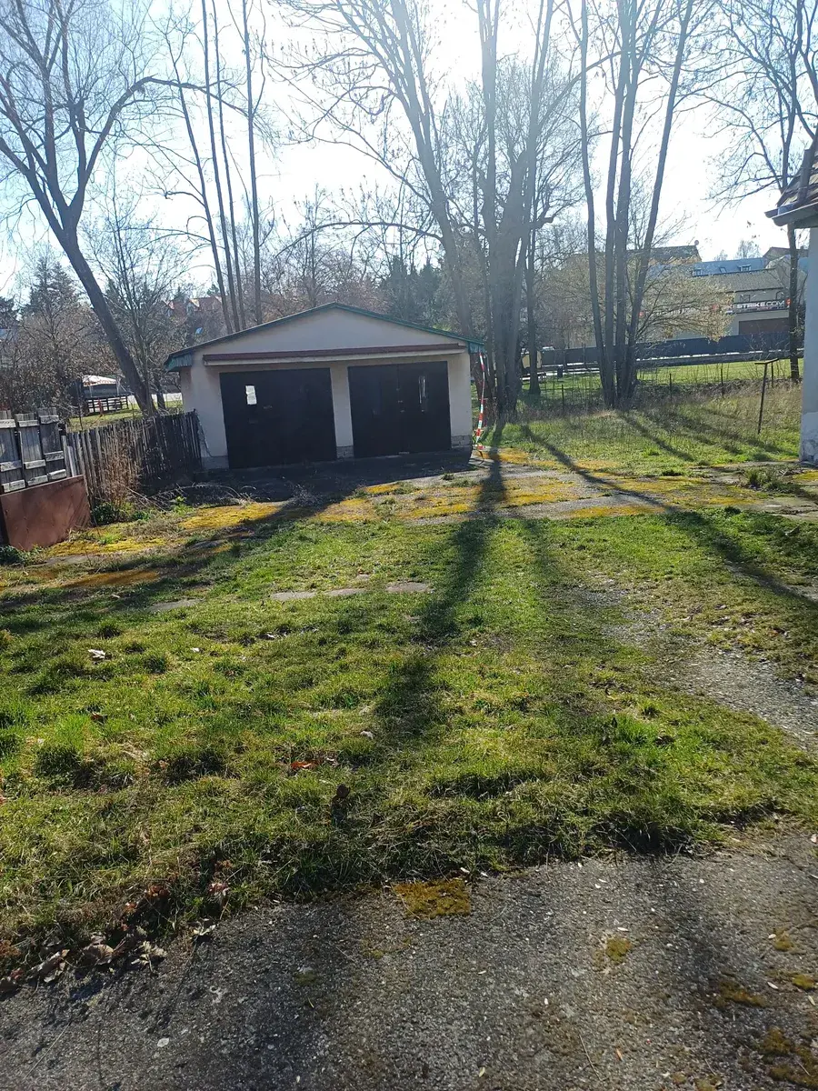 zděná stavba s dvojitými vraty a půdou, bez omítky, nezateplená, sloužící na skladování dřeva, uhlí a nářadí nebo stavebního materiálu a dále dvojgaráž, která není zapsaná v katastru nemovitostí.