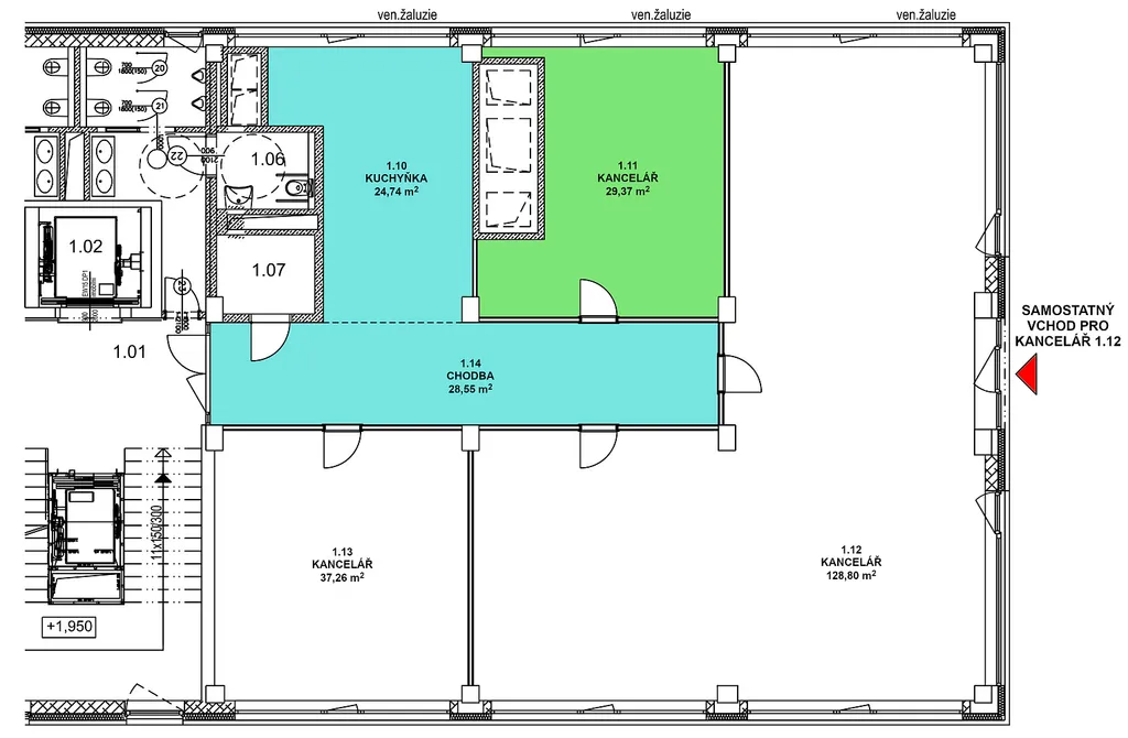 Místnost č. 1.11 s výměrou 22,52 m² s výhledem do ul. U věže.