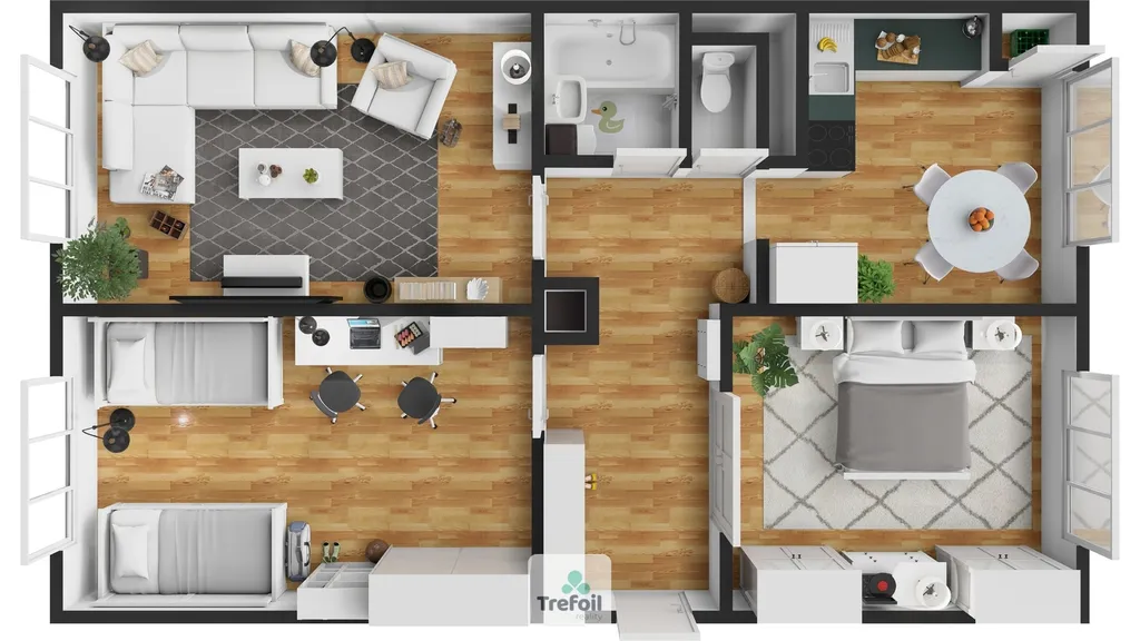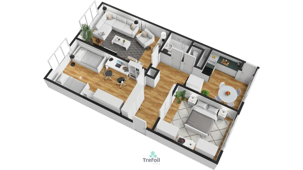 Vstup do bytu je přes předsíň, ze které se vchází do koupelny a samostatného WC, dětského pokoje, ložnice, obývacího pokoje a samostatné kuchyně. Byt je orientován na jižní a západní stranu. Anuita je plně splacena.