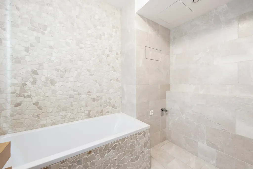 Koupelna je řešena ve velmi povedeném, až luxusním stylu s kamenným obkladem a vanou, ideální pro relax po dlouhém dni. Prostor koupelny zajišťuje dostatek místa pro umístění pračky, ta ovšem není součástí pronájmu. Toaleta je oddělena, což výrazně zvyšuje komfort bydlení.