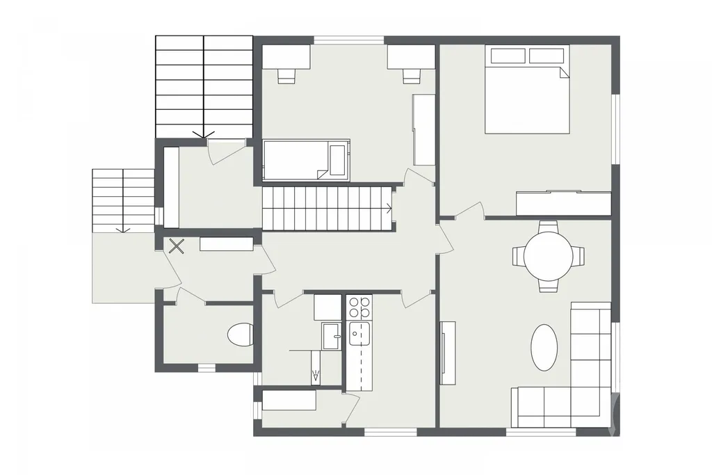 Dům je aktuálně rozdělen na dvě bytové jednotky 3+1 s většími pokoji. Obě mají cca 75 metrů čtverečních a vlastní vchod. Malým zásahem je propojíš klidně zpět v jeden celek. Popisuju to i ve videu, tak na něj koukni.