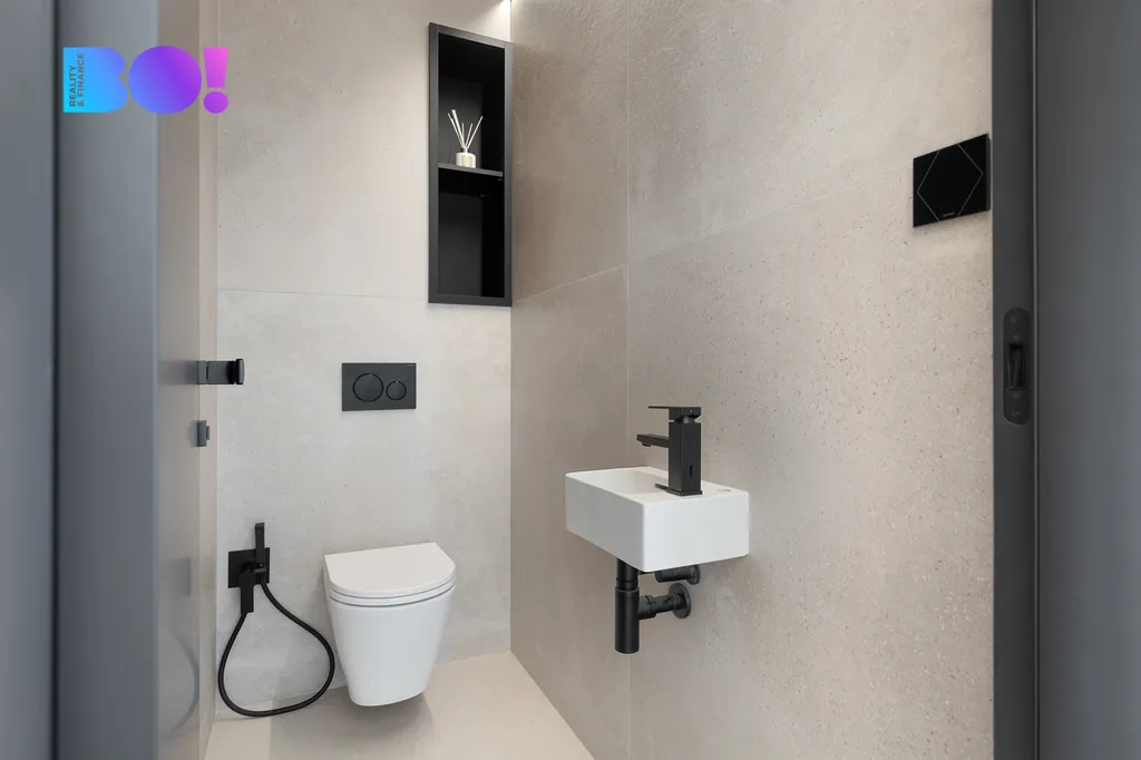 Interiér je sjednocen dubovými podlahami a nábytkem vyrobeným na míru z dubové dýhy. Kuchyňská linka v nadčasové kombinaci černého matného materiálu FENIX a dubu je vybavena prémiovými spotřebiči Siemens včetně indukční varné desky s integrovaným odsáváním, parní trouby, vestavěného kávovaru, vinotéky, myčky, lednice a mrazáku.