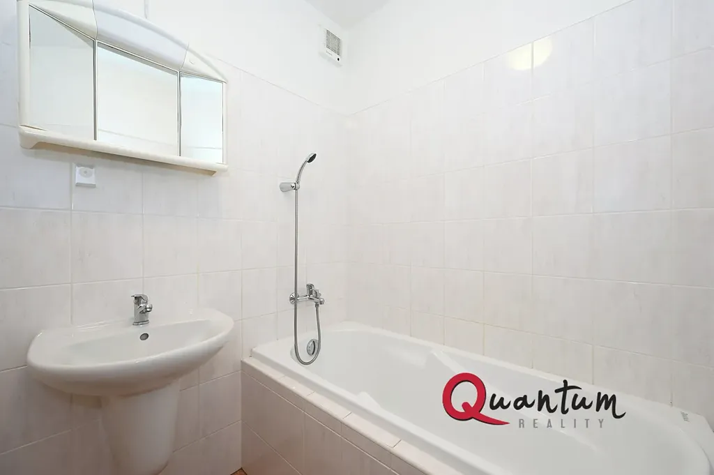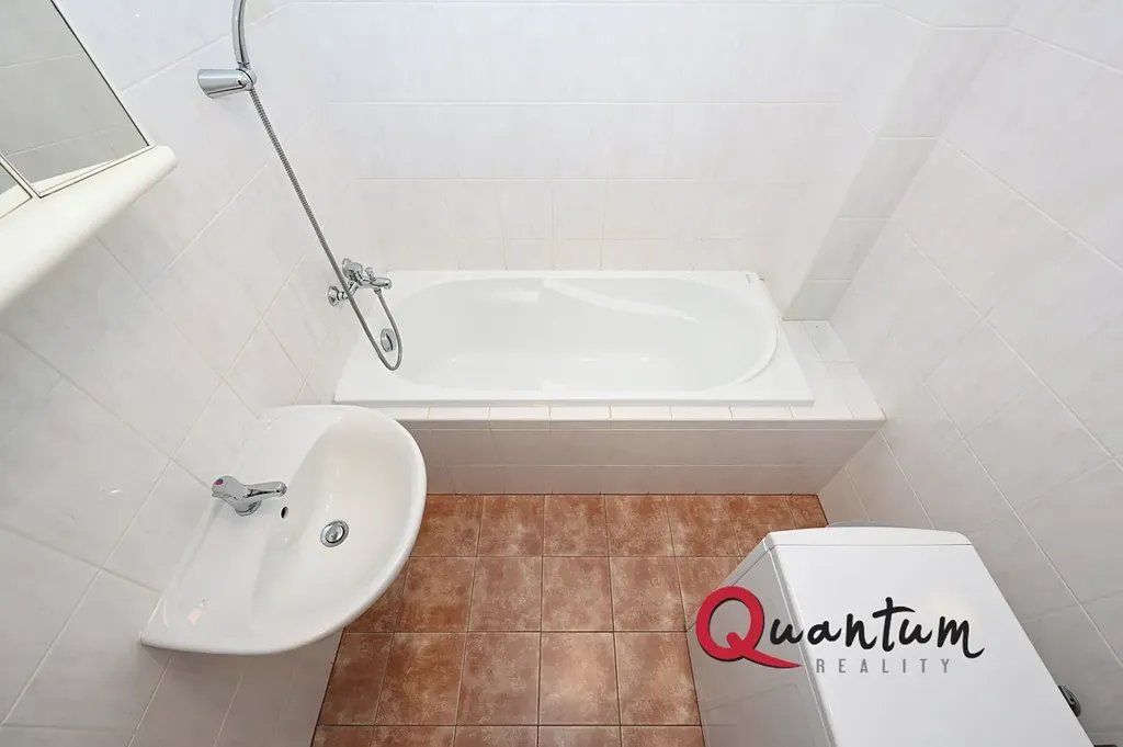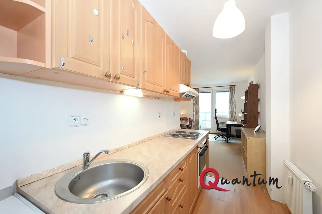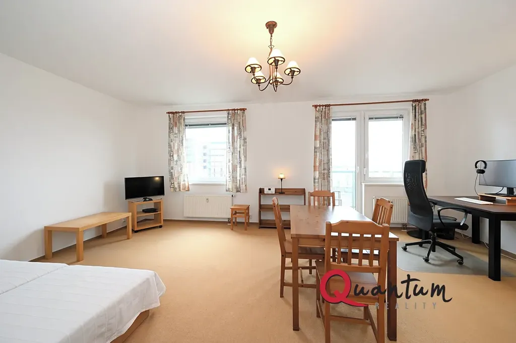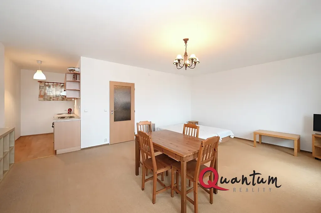 Nabízená bytová jednotka se nachází v 7. podlaží osmipodlažního domu s výtahem. Z pavlače je vstup do chodby s vestavěnými skříněmi, dále do velmi světlého obývacího pokoje (30 m2) s balkonem (3,4 m2), orientovaného na východ. Kuchyňský kout (5 m2) s oknem na západ a základním vybavením - elektrickou varnou deskou, troubou, digestoří a lednicí, je v samostatném výklenku. Koupelna má vanu, úložnou skříňku nad umývadlem a pračku. Toaleta je zvlášť. Na podlaze obývacího pokoje je koberec, v kuchyňském koutu plovoucí podlaha a v ostatních prostorách dlažby. Byt se pronajímá jako zařízený - 2x postel, jídelní stůl se židlemi, pracovní stůl s kancelářskou židlí, 3 regálové skříňky, televizní stolek, TV a konferenční stůl - viz fotografie.