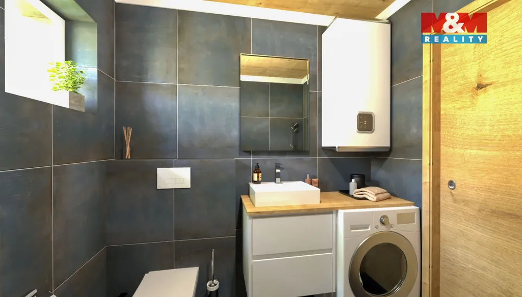 Interiér je kompletně vybaven – klimatizace, koupelnový infrazářič a elektrický kotel pro ohřev vody. Kuchyň zahrnuje myčku, lednici i mikrovlnnou troubu. V koupelně najdete kvalitní keramické obklady, prostornou vanu, toaletu a přípojku na pračku.