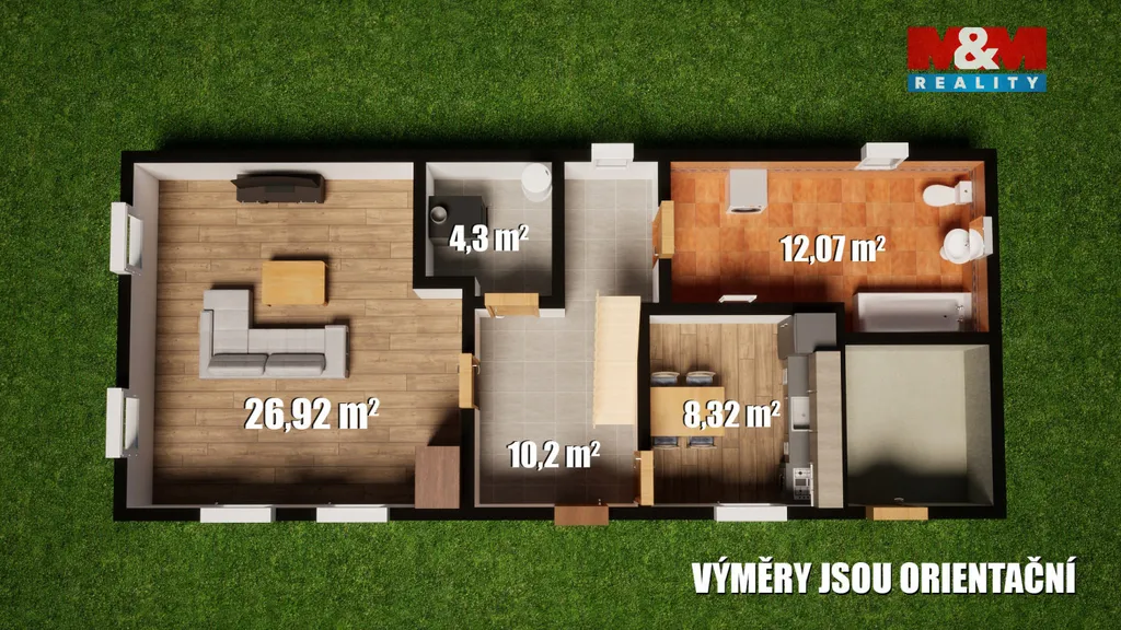 V přízemí se nachází kuchyň, prostorný pokoj a koupelna s vanou a toaletou.