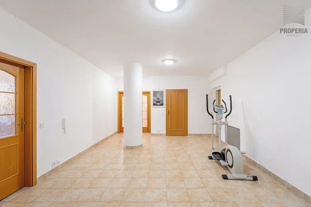• Koupelna (9,4 m²) – velmi prostorná, s vanou, sprchovým koutem, dvěma umyvadly a druhým WC