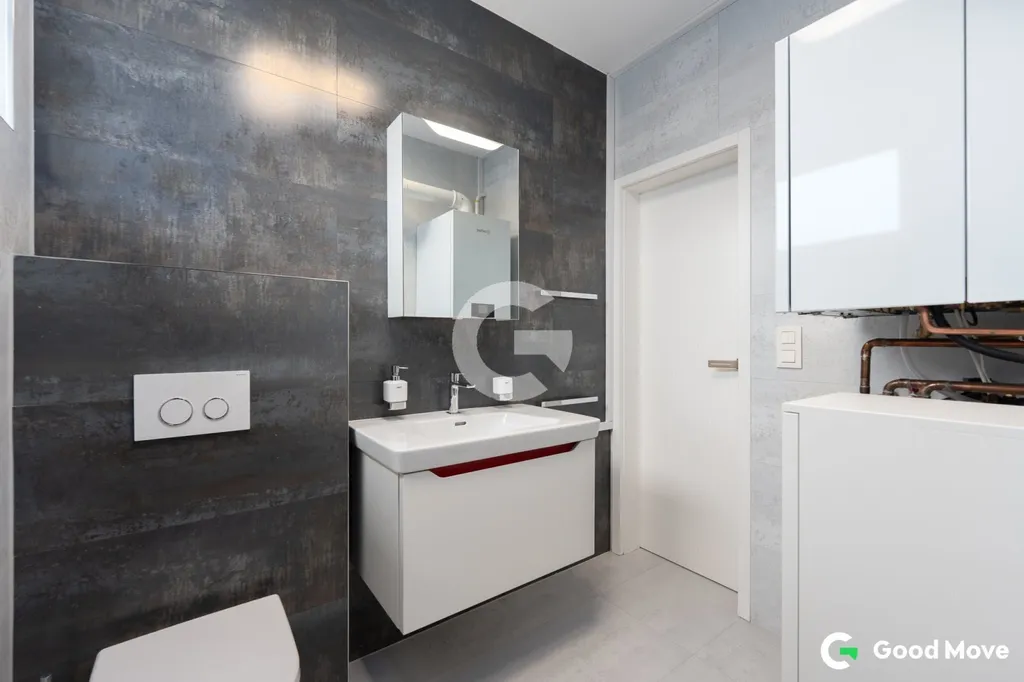 Koupelna o rozloze 6 m² je vybavena moderním, prostorným sprchovým koutem, toaletou se samostatnou bidetovou sprškou, umyvadlem, koupelnovou skříňkou a kvalitními sanitárními prvky značky Laufen. Baterie jsou od renomované značky Tres. O vytápění se stará nový plynový kondenzační kotel Vaillant (instalace 2023), který zajišťuje úsporný a komfortní provoz.