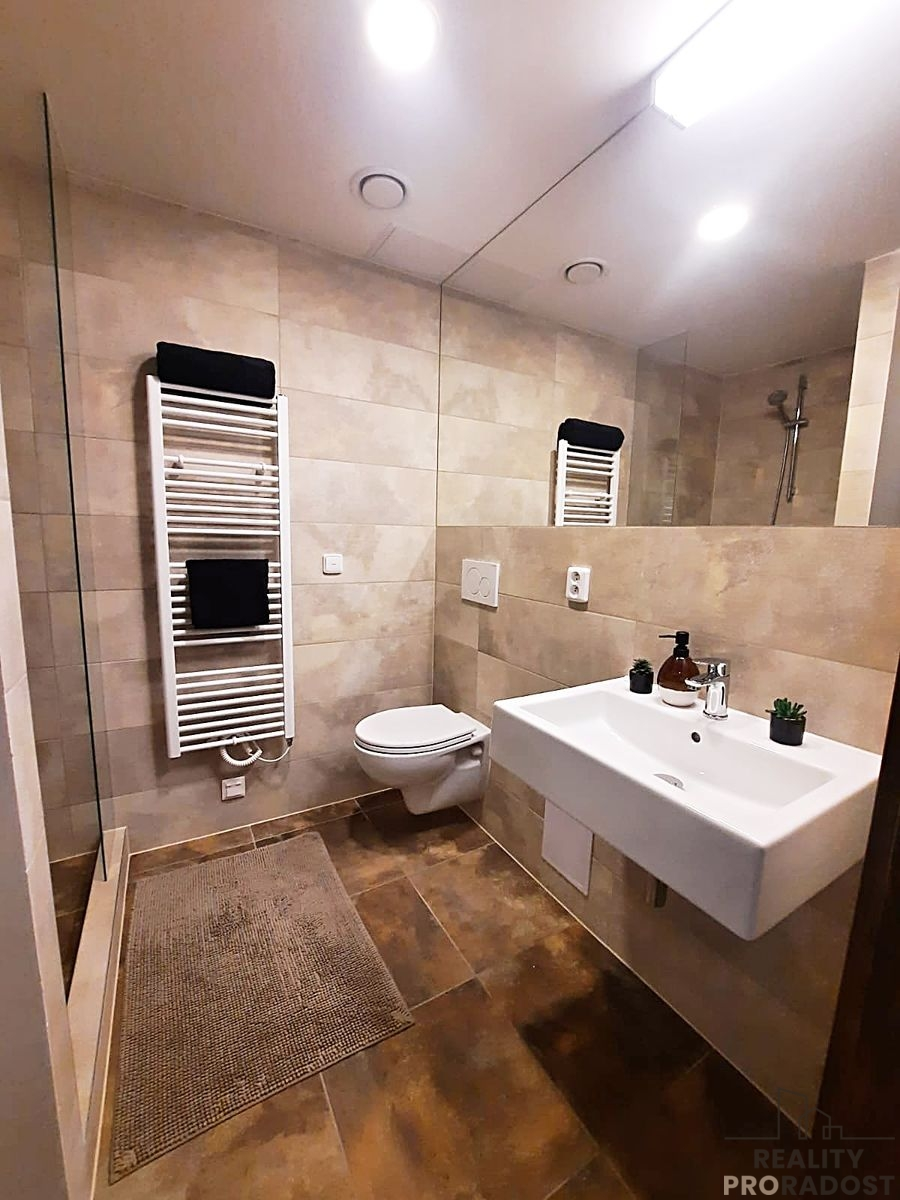 K dispozici je kuchyňská linka vč. vestavěné varné desky, elektrické trouby a digestoře. Vytápění vlastní elektrické, ohřev vody boilerem, rekuperace vzduchu. Prostorná koupelna nabízí velký sprchový kout, závěsné WC, umyvadlo, přípojku na pračku i dostatek místa pro úložné prostory.