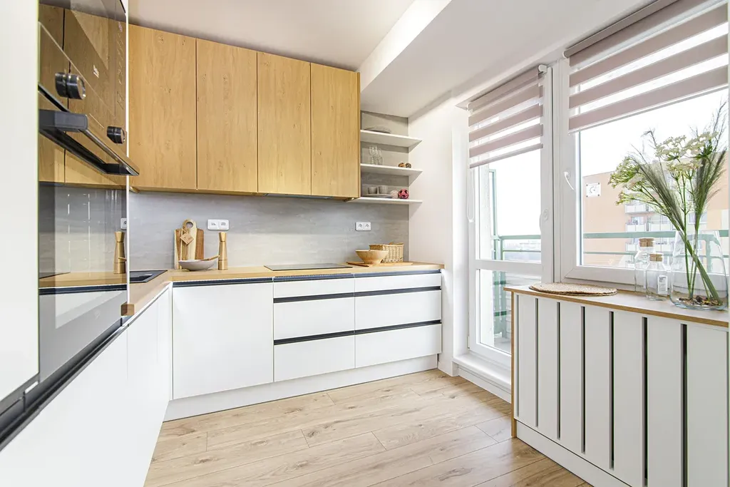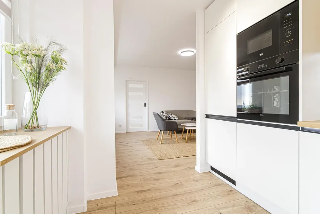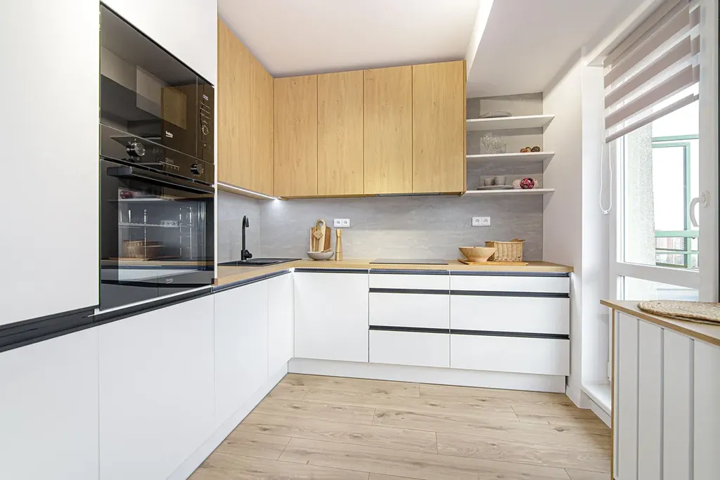 V kuchyni je nová rohová kuchyňská linka včetně spotřebičů lednice s mrazákem, indukční varná deska, horkovzdušná trouba, mikrovlnná trouba, myčka a digestoř. Z kuchyně je vstup na balkon.