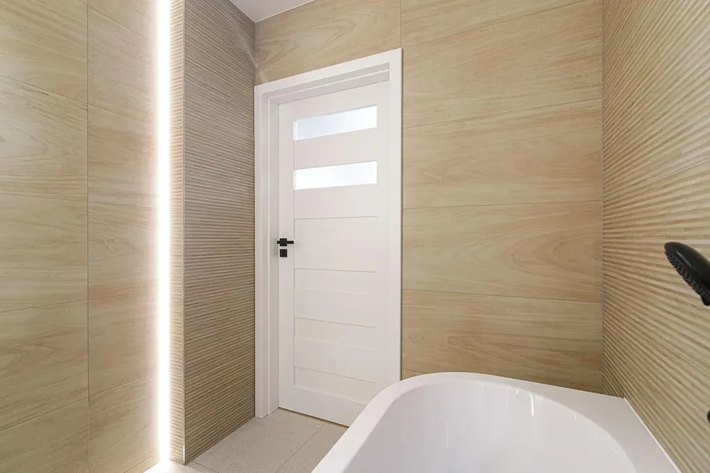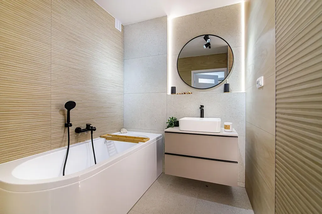 Zděné bytové jádro, prostorná koupelna s velkoformátovými obklady a dlažbou disponuje vanou, toaleta je samostatná.