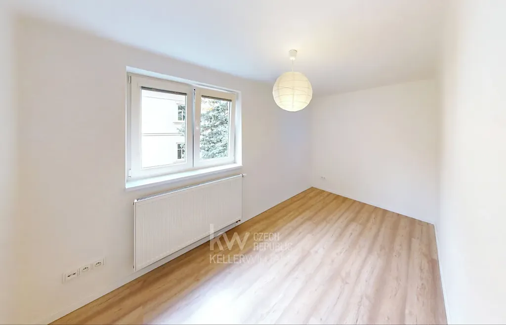 3+kk s výhledy do okolní zeleně v druhém nadzemním podlaží cihlového činžovního domu bez výtahu. Tento byt