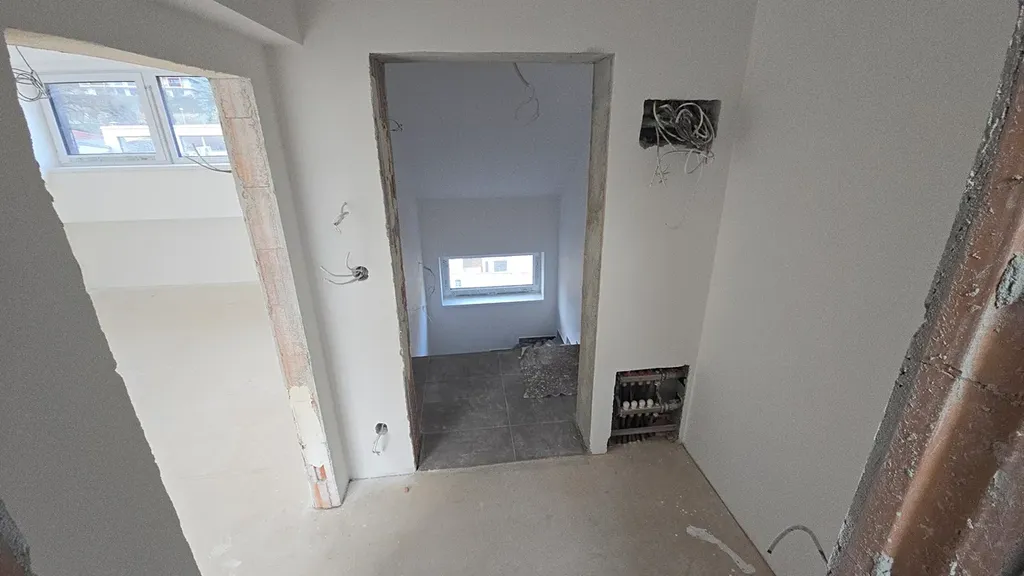 Dispozičně 2+KK (dělicí příčka se ještě bude dodělávat), ideální pro jednotlivce nebo pár. Obývací část s kuchyní (dodáváme standardně bez kuchyňské linky) a vstupem na balkon. Předsíňka s prostorem pro pračku a úložné prostory a koupelna s vanou (změna oproti projektu z půdorysu).