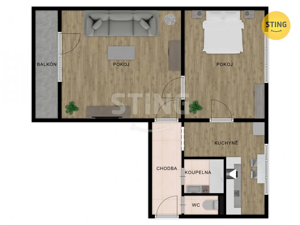 Dispozice: samostatná kuchyň, dva pokoje (z jednoho vstup na balkon), koupelna s vanou a umyvadlem, samostatné WC.