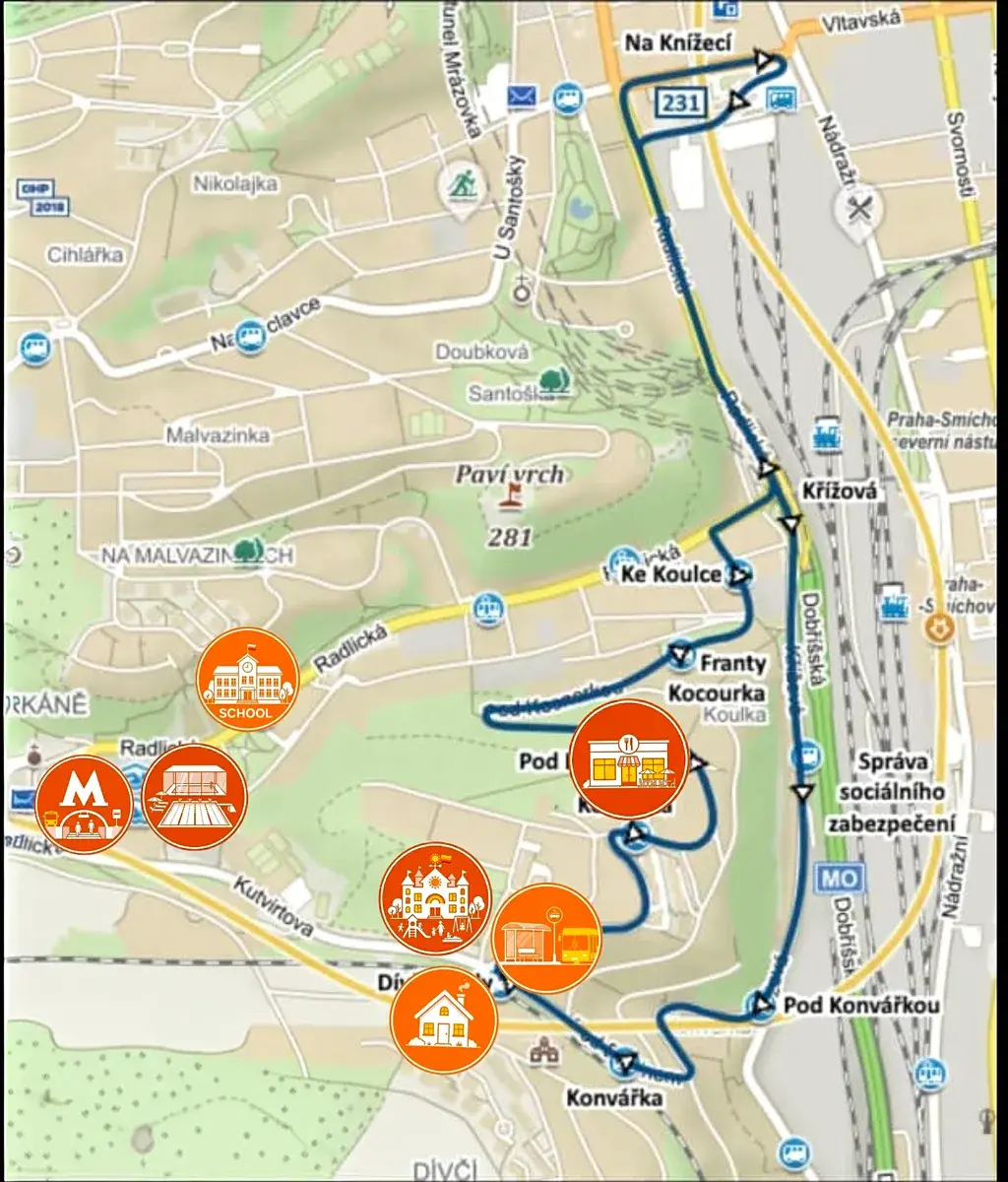 Osobním autem nebo taxíkem se lze snadno vyhnout dopravní zácpě, která se obvykle tvoří na Radlické ulici, pokud pojedete po trase autobusové linky 231