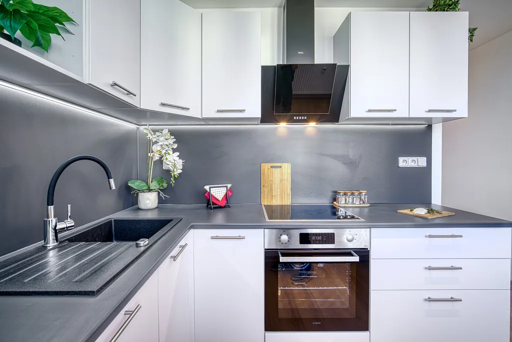 Dominantou bytu je hlavní obytný prostor s průchodem do kuchyně, která byla vyrobena na míru. Součástí kuchyně je varná deska, digestoř a myčka.