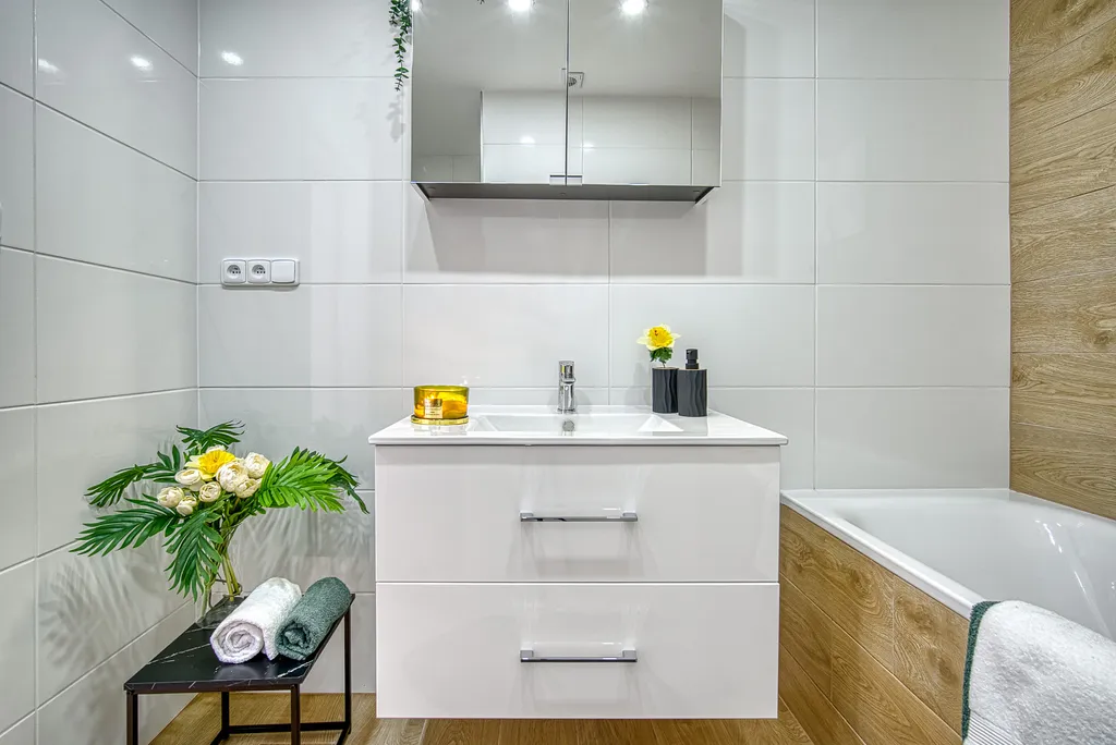 V koupelně je umístěna vana, umyvadlo se zrcadlem a příprava na připojení na pračku. Součástí je i samotná místnost s toaletou. K bytu náleží i sklepní kóje, kterou naleznete v přízemí domu.