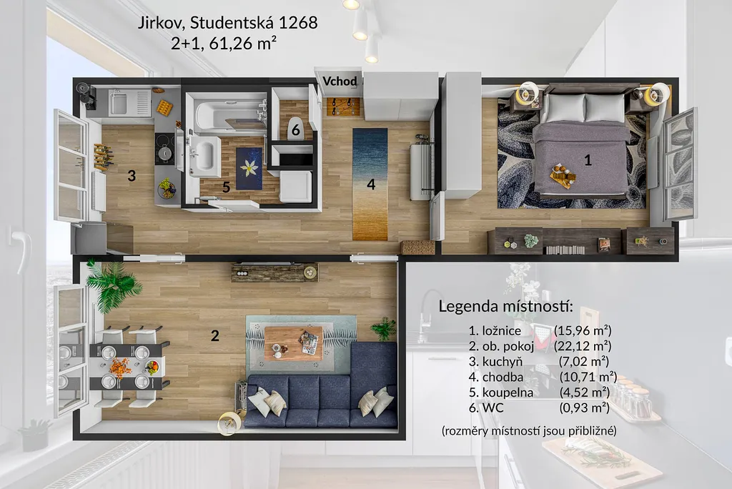 Pronájem nově zrekonstruovaného bytu 2+1 v Jirkově, ulice Studentská s celkovou výměrou 61 m²