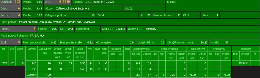 - p.č. 142/2 vedená jako lesní pozemek o celkové výměře 2 228 m2 (stáří lesa 79 let - zastoupení dřevin modřín, borovice).