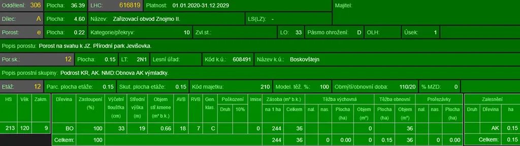 - p.č. 15 vedená jako lesní pozemek o celkové výměře 2 176 m2, z toho vlastníme podíl 18/20 tedy 1 959 m2 (stáří lesa 126 let - zastoupení dřevin borovice).